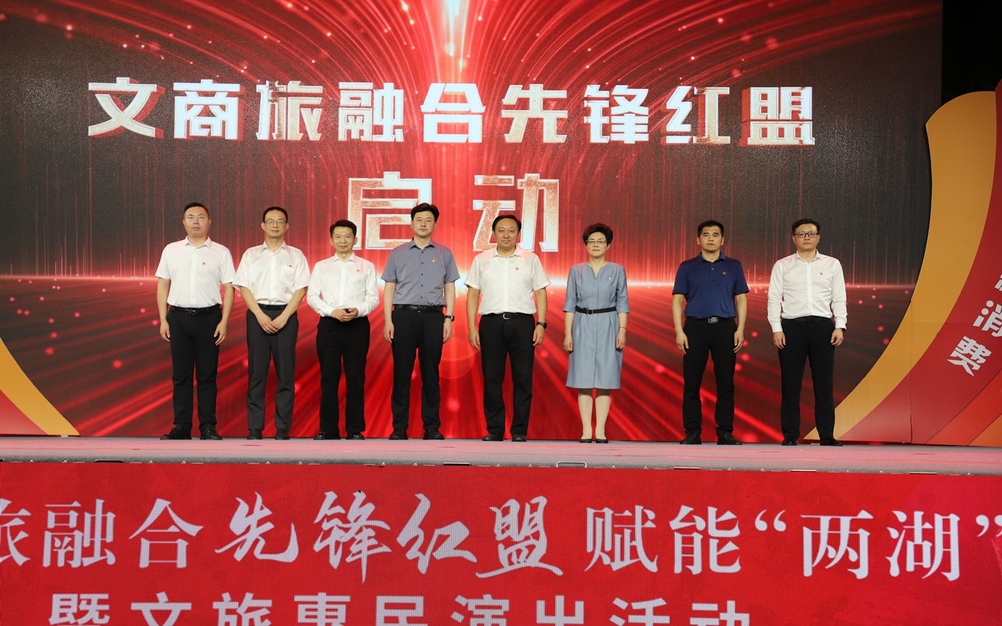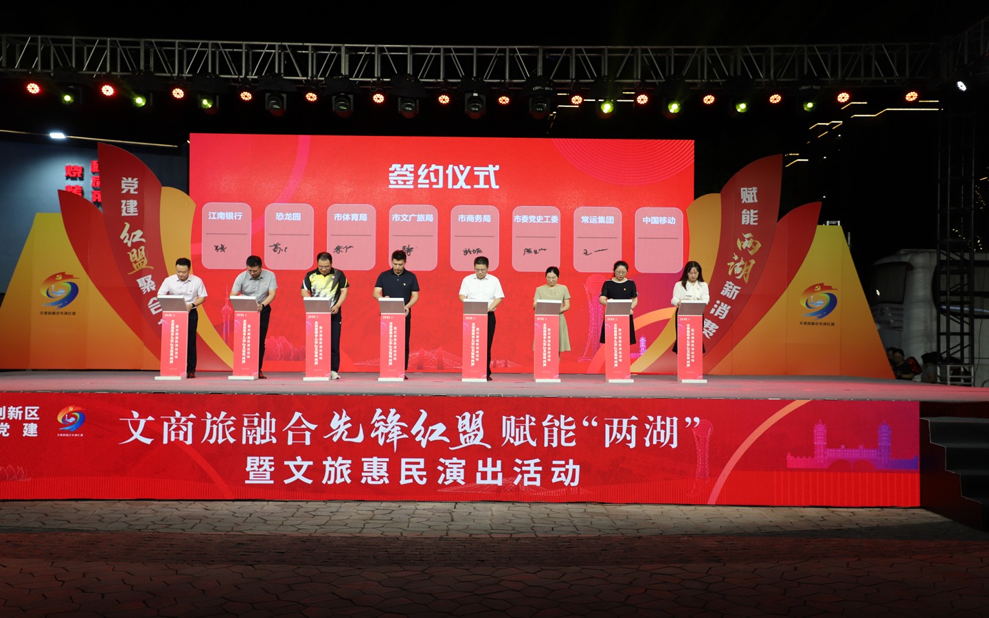 9月13日晚,“黨建紅盟聚合力、賦能兩湖新消費”文商旅融合先鋒紅盟賦能“兩湖”暨文旅惠民演出活動在藍海豚文化藝術街區成功舉行。市級機關工委書記趙天晟,副書記潘奕,市文廣旅局黨組書記、局長嚴俊,市商務局黨組書記、局長韓雪琴,市黨史工委主任柯善學等領導出席活動;金壇、武進、鐘樓區文旅(體育)、商務、黨史部門領導及恐龍園、江南銀行、常州移動等紅盟單位重點企業領導參加活動。集團公司黨委書記、總經理朱平春、副總經理黃細富等領導及街區商管公司相關人員參加活動。