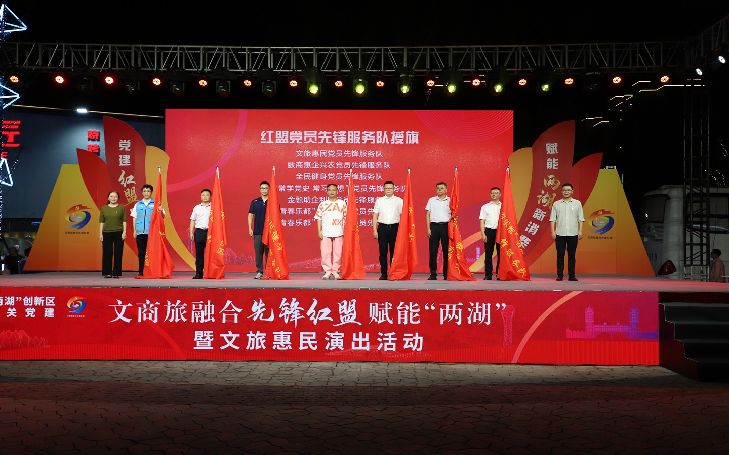 活動現場,集團機關黨支部作為“紅盟助力街區夜消費”重點項目黨支部參加共建簽約,成立的“青春樂都”客運保障黨員先鋒服務隊參加了現場授旗儀式?,F場還發布了《“兩湖”創新區文商旅融合先鋒紅盟行動方案》以及“兩湖”創新區夜間文商旅消費集聚區典型案例,集團轉型開發項目——藍海豚文化藝術街區上榜。
